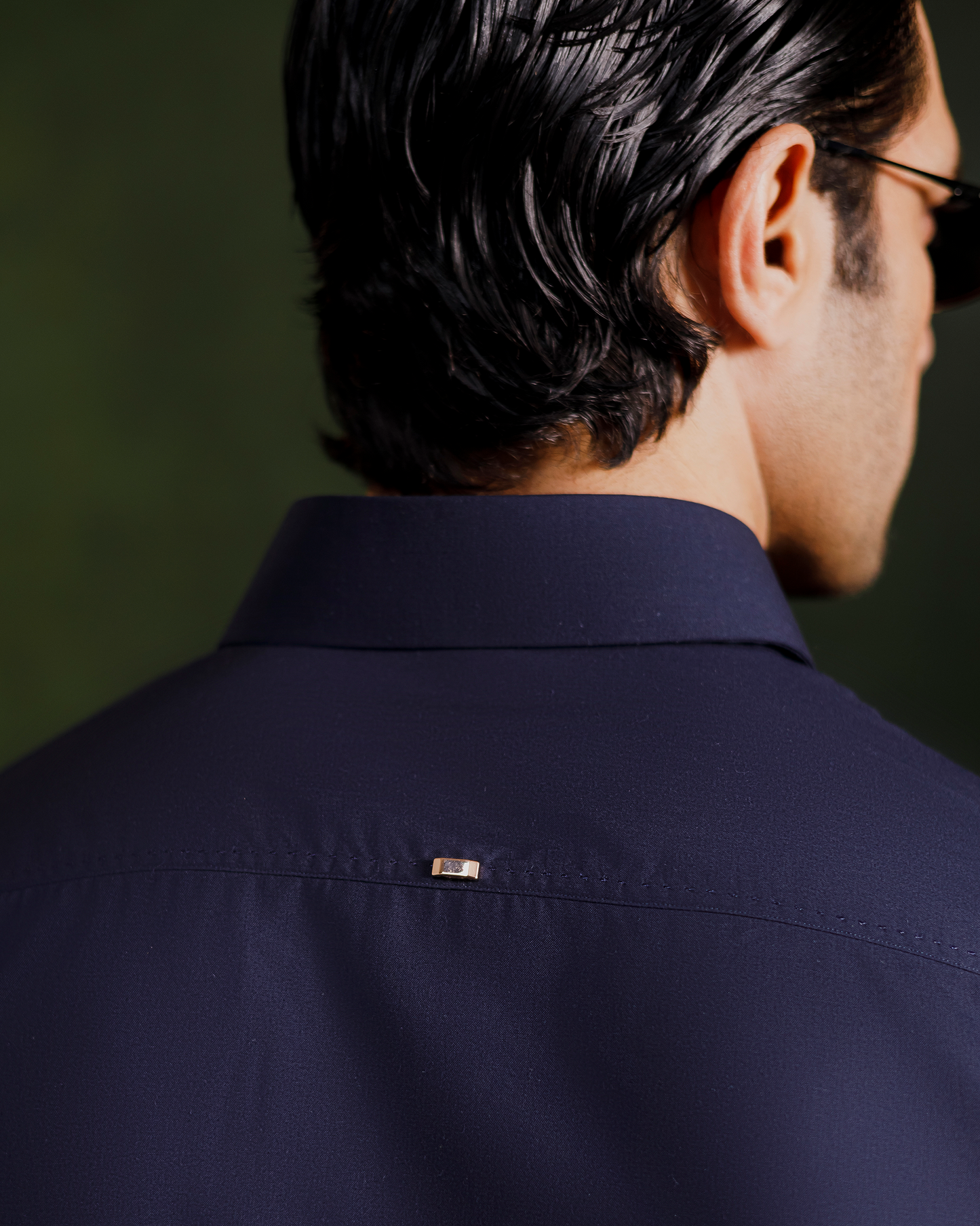 - Subtle metal accents on cuffs and back yoke